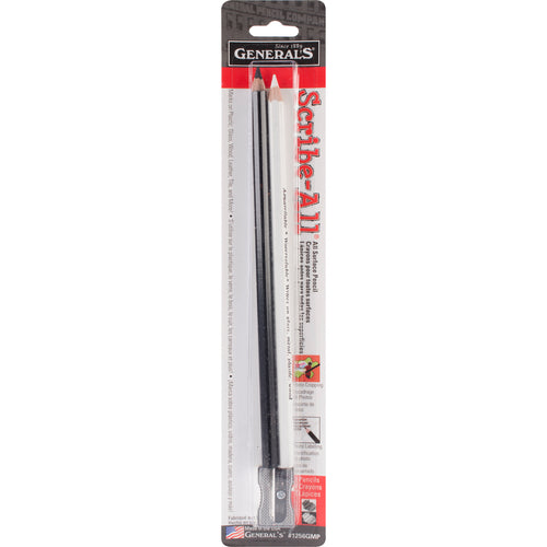 GENERAL PENCIL-Scribe-All All Surface Pencils. These multi- purpose pencils are ideal for writing on plastic, glass, metal, wood, vellum, tile, ceramic, and more. They are acid-free, non-toxic and photo safe. This package contains one white pencil, one black pencil, and one steel sharpener. Made in USA and Imported.