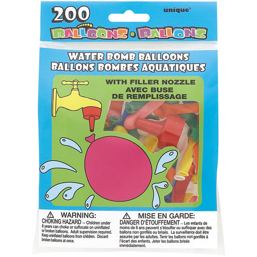 UNIQUE INDUSTRIES-Water Bomb Balloons. This package contains 200 water balloons made from natural rubber latex. Also included is a plastic filler nozzle that can be attached to water taps for easy filling. Imported. WARNING-Choking Hazard-Children under 8 years can choke or suffocate on uninflated or broken balloons. Adult supervision required. Keep uninflated balloons from children. Discard broken balloons at once. Imported.