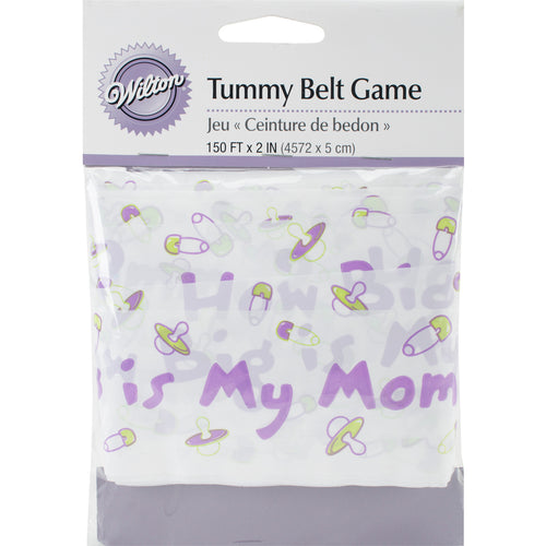 WILTON-Party Game. This game will make guests guess! Guests will mark and cut the ribbon to match their guess of mom-to-be's tummy size. At the end of the shower, mom-to-be makes the actual measurement and announces which guess is closest. This package contains 150ft of 2 inch wide ribbon. Imported.