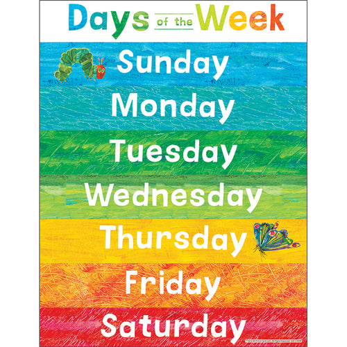 Give young learners the perfect visual resource with the 17" x 22" World of Eric Carle„ Days of the Week Chart. This chart will help students recognize, read, and spell the seven days of the week. Featuring a fun, colorful design and well-loved figures from the imagination of Eric Carle, this chart will brighten and enliven any classroom.