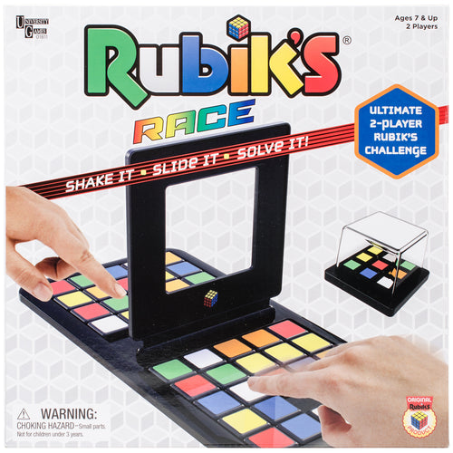 University Games-Rubik's Race Game. Shake the scrambler to create a new Rubik's pattern. Slide the tiles to match the pattern on your board to the pattern in the scrambler. Solve it! The first player to complete the match and slam down the center frame wins! This 10- 3/4x10-3/4x2 inch package contains one game base and center frame, forty-eight colored tiles, one scrambler, nine colored mini cubes and instructions. Recommended for ages 7 and up. WARNING: Choking Hazard- small parts. Not for children under 3 years. Imported.