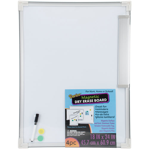 Darice-Magnetic Dry Erase Board. Perfect for work, home and school! This package contains one 24x18 inch magnetic dry erase surface within one hard aluminum frame with hangers, one removable tray, two magnetic pins and one dry erase marker. Conforms to ASTM D 4236. Imported.