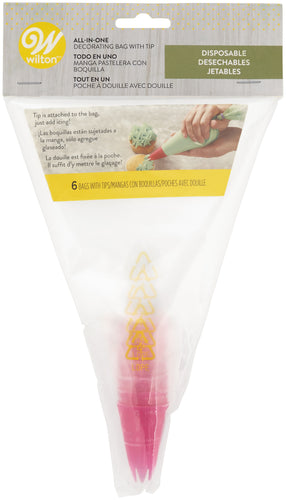 These all-in-one disposable decorating bags are so simple to use. The tip is attached to the bag, so there's no fitting or cutting, just fill with your favorite frosting and you're ready to go. Great for decorating cakes, cupcakes or brownies. Just ice your treats, then toss when you're done! This 6x10 inch package contains six disposable decorating bags with tips. Imported.