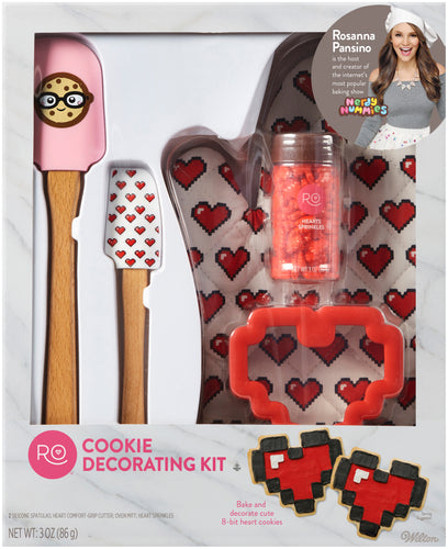 Bake adorable 8-bit heart cookies with this Rosanna Pansino Cookie Decorating Kit. An easy and fun way to bake treats for friends and family. It is also a great gift for young beginning bakers. This package contains an 8-bit heart cookie cutter, two silicone spatulas, 8-bit heart sprinkles and an oven mitt. Imported.