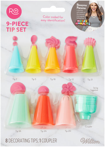 Now you can decorate just like Ro with this Rosanna Pansino Decorating Tip Set. This set includes various star and round tips, great for piping borders, accents, and much more. Use the coupler to easily change between tips. This 5.25x7.25x1.25 inch package contains nine assorted decorating tips. Imported.