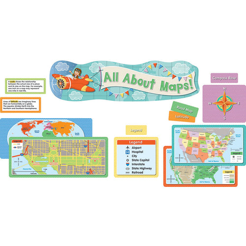 Help your students build navigation skills with the 34-piece All About Maps mini bulletin board set. This geography bulletin board set provides clear, visual support when teaching about different kinds of maps, features of maps, and how to read maps. Set includes: 1 header (20.25" x 5.5"), 11 definition cards (5.5" x 2"), 11 example cards (smallest 6.25" x 5.5"), and 11 word cards (smallest 2.75" x 1.25", largest 3.5" x 1.25").