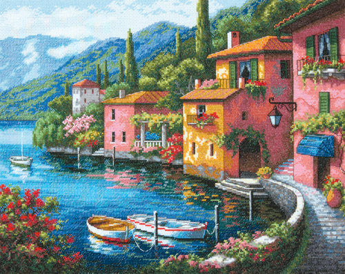 DIMENSIONS-The Gold Collection: Counted Cross Stitch Kit. Gorgeous images, phenomenal detail, and the highest quality of materials available go into every Gold Collection kit. Each of these counted cross stitch kits feature easy to follow charts that include the use of half stitches to elicit finer details and more realistic shadows. This kit contains 16-count light blue cotton Aida, presorted cotton thread, needle and instructions. Frame/Mat not included. Design: Lakeside Village. Finished size: 15x12 inches. Designer: Sung Kim. Imported.