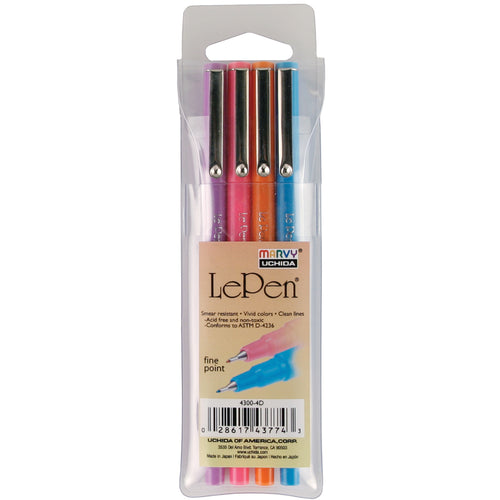 MARVY UCHIDA-LePen. A smooth-writing pen with a delicate touch. LePens have a smooth and sleek design and smudge-resistant ink. Perfect for paper crafting projects. This package contains four LePens with 0.3mm points: black, blue, red, and green. Acid free and non-toxic. Conforms to ASTM D4236. Imported.