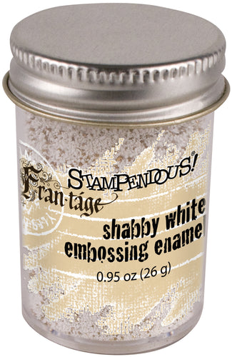 STAMPENDOUS-Shabby Embossing Enamel: White. This chunky, vintage-inspired embossing powder will provide a thick layer of enamel to your artwork. You can impress an inked stamp into it like our Deep Impression Powder. Sprinkle it on your artwork and heat from beneath for a shabby chic/vintage look. This package contains .86oz of embossing enamel. Made in USA.