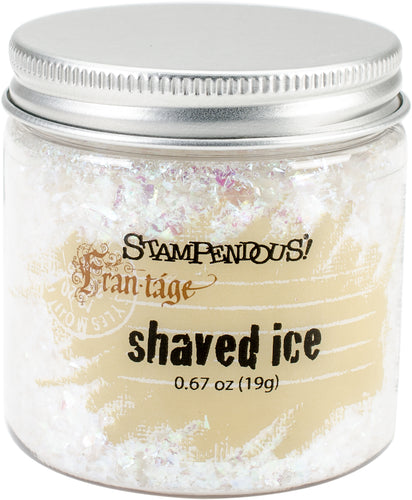 STAMPENDOUS-Shaved Ice. This generous jar of Shaved Ice is glitter taken to the max. The large, irregular chunks of bling will spice up any project with the snowy look of a winter day. This package contains 0.67 ounces/19g of shaved ice. Imported.
