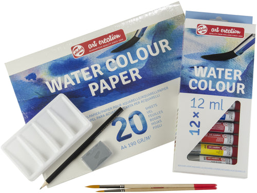 Talens Art Creation makes it easy to capture creative ideas. It is the perfect paint for the novice artist looking to paint with watercolors. Watercolor is water-thinnable, so you can paint with transparent colors. The more water you use, the lighter the paint. If you apply colors wet-into-wet they flow into one another. This 12.625x8.25x1.5 inch package contains 12 12ml tubes of watercolor paint in assorted colors, one A4 paper block with 20 sheets, two brushes, one mixing tray, one pencil and one kneadanle eraser. Conforms to ASTM D 4236. Imported.
