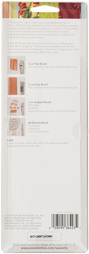 Perfect for all your crafting and home decor projects. The painted and patterned handles are functional and comfortable. The nylon bristles keep their shape and maintain edges after many uses. This package contains one #6 round brush, one .5 inch angled brush, one .75 inch flat brush and one .75 inch chip brush. Imported.